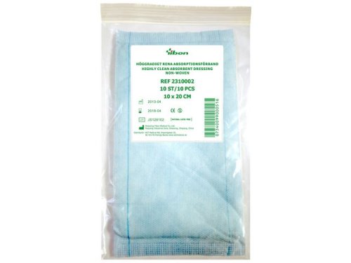 Absorptionsförband - flerlagers - Höggradigt rent - Latexfritt - Yttermaterial: Non-woven av PP/PE - Vätskeavvisande sida: Blå - Vikt: 33 g/m² - Innermaterial: Non-woven av PP - Absorberande sida: Vit - Vikt: 18 g/m² - Uppsugande innerkärna: Flerlagers bomullsfluff med omslag av non-wovenväv som fördelar vätskan - jämnt i förbandet. - Absorption enligt EN 13726-1: 2002 (se också tabell nedan): ? 4 g/10cm²/24h - Bytesintervall: 1-3 gånger per dygn beroende på sårsekretproduktion, när aborptionskapaciteten är - uppnådd eller enligt läkarordination - Autoklaverbar: Kan steriliseras i EO och ånga 135 ºC - CE-märkning: Klass 1 enl MDD - Tillverkning: Kina - Certifiering: ISO 9001:2008 & ISO 13485:2012 - Lagring: 5 år från tillverkningsdatum, på torr och sval plats utan direkt solljus eller påverkan från - värmekälla.