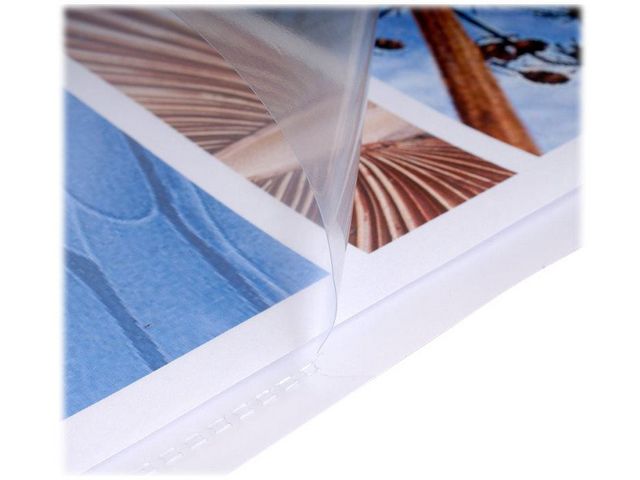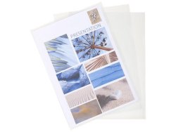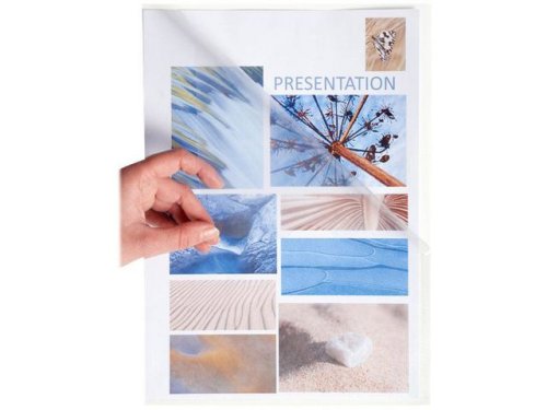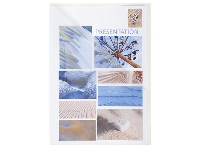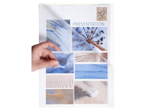 Aktmapp i A4-format av hög kvalitet med öppning upptill och halva höger sida. Mappen är tillverkad av klar blank polypropylen-plast.
