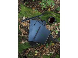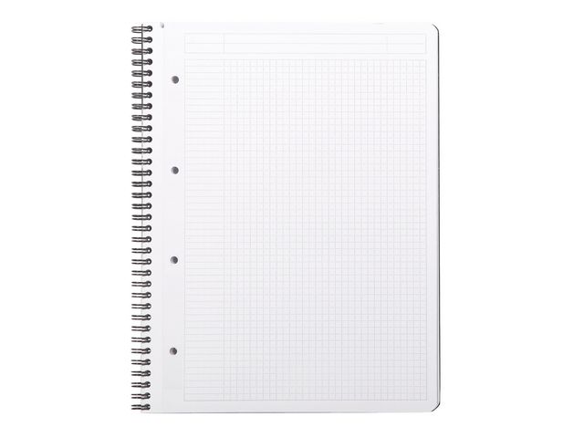 Anteckningsblock Rhodiactive Greenbook har format A4+ och rutat papper av återvunnet papper FSC® certifierat 90g papper. Rutorna är 5x5mm och varje sida har en större ruta för överskrift eller rubrik. Spiralbunden rygg och 80 blad som är mikroperforerade och stansade med fyra hål.