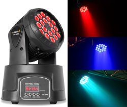 Ett 11-kanals DMX-styrt rörligt huvud med 18 kraftfulla 3W-lysdioder som ger en färgstark tvätteffekt. Med variabel elektronisk strobe och dimmer, makroprogram, avancerad funktionskontroll och panorering / lutning med inverteringsalternativ och hastighetskontroll. Kan också fungera som en mästare / slav, oberoende eller musikstyrd.Perfekt för dansgolv, fester och scen. DMX, master/slave sync eller autoprogram, ljudstyrning (Inbyggd mikr).