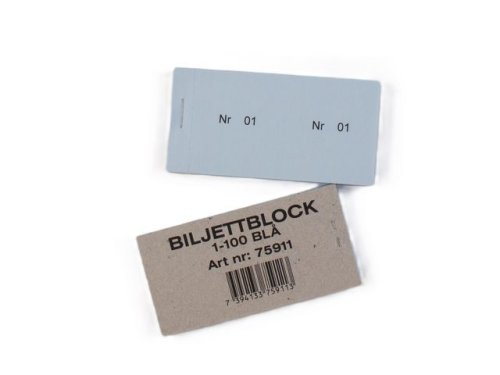 Biljettblocket är klamrat med två perfar. Texten är tryckt i svart på FSC- och Svanen-miljömärkt 70 grams svenskt papper.