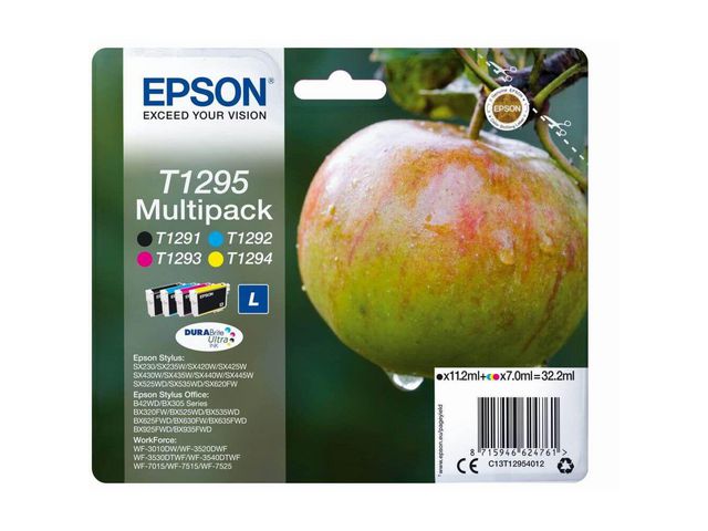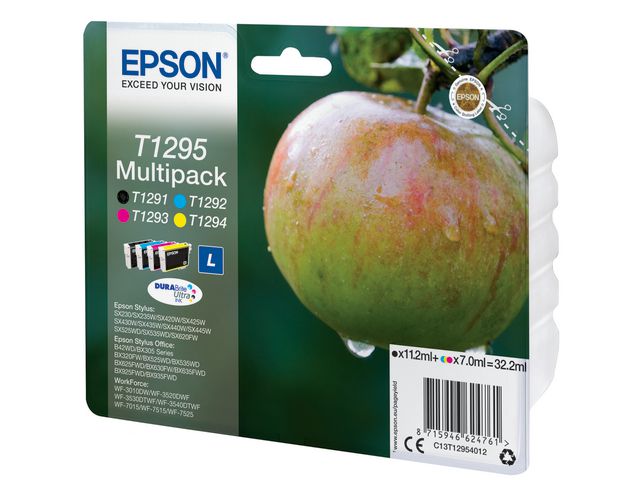 Epson T1295 DURABRite Ultra levererar klara utskrifter, oavsett om det är textdokument eller foton. Epson bläckpatroner är skapade med kvalitet och prestanda i åtanke, Epson T1295 DURABrite Ultra bläckpatron är ekonomisk och enkel att använda. Epson DURABrite Ultra serien är designad för att producera högkvalitativa dokument och livfulla bildutskrifter. Den här bläckpatronen passar bäst tillsammans med Epson-skrivare, tillsammans genererar de utmärkta utskrifter. - Modell: T1295 - Högkvalitativa utskrifter - Färg: Svart, Cyan, Gul, Magenta - Kompatibel med: Stylus : SX425 / SX525WD / BX305SF / BX320FW / BX625FWD