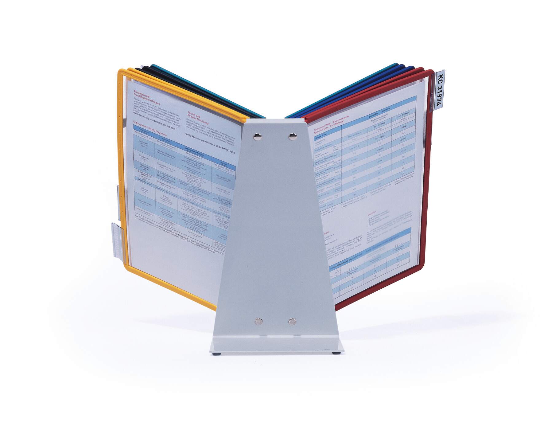 Informations och presentationsställ som har många olika namn; panel-, display-, översikts-system, vingregister, PLU-hållare, dokumenthållare, lathund.... Oavsett namn så har det många användningsområden på kontor, i butiker, kök, kassadiskar, utställningar mm. Information som används ofta förvaras i översiktssystemet, är överskådligt och lätt att hitta. VARIO® TABLE 10 är ett komplett bordställ med 10 st reflexfria, skanningsbara plastfickor (svarta, röda, gula, gröna och mörkblå) av polypropylen för dokument i A4-format. Flyttbara 58 mm rubrikhållare ingår. Vid insättning och borttagning av fickorna är det bra att böja fickan lite försiktigt i mitten längs med inre långsidan så går det lätt att sätta dit och ta bort fickan utan att piggarna i hållaren skadas. Gummitassar gör att den står stadigt. 5 års garanti. Garantivillkoren finns här: https://www.durable.se/sv_SE/service/garanti/garanti-foer-sherpa-vario/