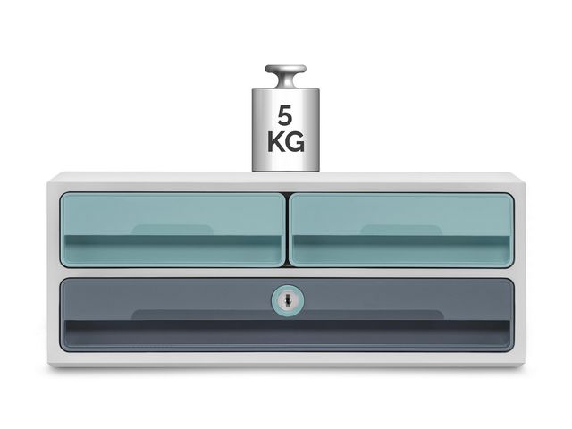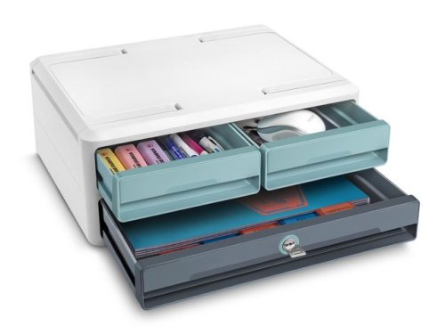 Multifunktionellt lådsystem som kan användas både för förvaring och som ett robust bildskärmsställ för din datorskärm (upp till 5 kg). Lådsystemet är dessutom försett med praktiska handtag så att det går lätt att transportera. Lådsystemet har tre låsbara lådor, två mindre för t.ex. skrivredskap och en stor med plats för dokument, gummibandsmappar, surfplattor och bärbara datorer upp till 14'. Det är tillverkat av plast och har måtten 14,6 x 36,9 x 27,5 cm (HxBxD).