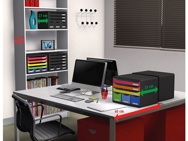 Färgglad blankettbox av 96% återvunnen plast. A4+ format med 6 lådor. Blankettbox STORE-BOX MAXI 6 lådor - 6 lådor - Med etiketthållare - Kan staplas - Storlek: 270x355x271mm - Återvunnen plast: 96 % - Format: A4+ ( Landskap)