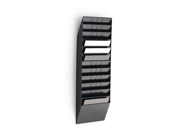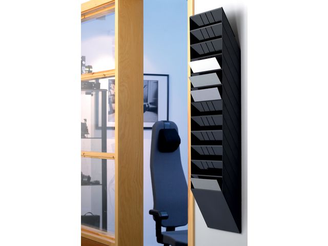 Organisera mappar, tidskrifter eller dokument i snygg väggdisplay. Montera denna Durable Flexiboxx väggdisplay på en vägg för snabb organisering av dokument, tidskrifter eller andra A4-papper. Skapa ett utrymme för visning av tidskrifter eller ett snabbt arkiveringssystem för A4-dokument med denna väggdisplay från Durable Flexiboxx. Med tolv fack ger den här horisontella displayen snabb ordning på kontor och i väntrum, samtidigt som designen är enkel att installera. Installera den här Flexiboxx-väggdisplayen på några minuter i alla rum som har användning för extra arkivering eller tidskriftsförvaring. - Organisera pärmar, tidskrifter eller dokument - 12 separata fack för organisation - Monteras horisontellt i liggande format - Färg: Svart - Väggdisplay med måtten 390 x 290 x 300 mm