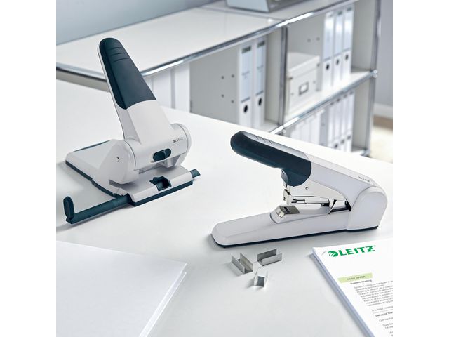 Häfta stora pappersbuntar enkelt med den här robusta och extra starka häftapparaten 5552 från Leitz. Häfta upp till 60 pappersark med den här extra starka häftapparaten från Leitz, som står platt för att spara utrymme. Den här enheten har en slitstark metallmekanism och är perfekt för krävande användning. Den har dessutom ett ergonomiskt handtag som gör det mer behagligt att häfta. Det finns ett siktfönster på sidan av enheten som gör det enkelt att se när du behöver fylla på häftapparaten. - Häftapparat som passar utmärkt för krävande användning - Metallmekanism i ett robust plasthölje - Står platt för att spara utrymme - Ergonomiskt handtag för bekväm användning - Inbyggt siktfönster för häftningsmekanism - Häftningskapacitet: 60 ark