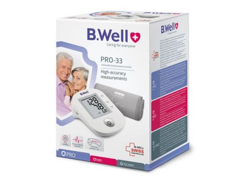 Blodtrycksmätare B.WELL Pro-33 är en mycket precis och pålitlig blodtrycksmätare som är enkel att använda. Med anatomiskt manschett för komfort och korrekta resultat. Blodtrycksmätare Pro-33 M Manschett hjälper till att identifiera pulsfel i ett tidigt skede. Om blodtrycksmätaren upptäcker instabilitet i pulsfrekvensen och känner igen arytmi vid mätning av artärtrycket, visar den en speciell symbol. B.Well-tekniken upptäcker de första tecknen på arytmi, vilket gör att patienter kan besöka sin läkare och få hjälpatt behandla hjärtsjukdomar i rätt tid. Klassisk teknik ger bekväma mätningar och exakta resultat. I början av mätprocessen bestämmer blodtrycksmätaren den optimala nivån på manschettinflationen för den specifika bäraren. Korrekt trycknivå i manschetten hjälper till att uppnå de mest exakta resultaten utan överdriven kompression. Den anatomiska B.Well manschetten har en perfekt passform för att fördela lufttrycket jämnt och säkerställa en smärtfri mätning. Manschetten är bekväm för självmätning och har en fläktform, en speciell metallring och ett brett snäppe som gör den enkel att ta på med bara en hand. Manschetten kan enkelt och enkelt rengöras tack vare det avtagbara överdraget. - 1 minne (senaste mätningen) - Automatisk avstängning - Indikator för batteritid - Innehåller: - Automatisk blodtrycksmätare, modell PRO-33 - Manschett i anatomisk M-storlek för en omkrets på överarmen på 22-32 cm - Avtagbart manschettöverdrag - Batterier av AAA-typ - 4 st. - Instruktionsmanual - Förvaringsväska