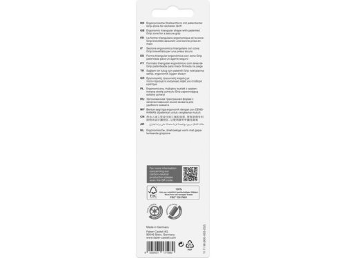 Blyertspennan Faber-Castell GRIP 2001 har en ergonomisk triangelform och en mjuk greppzon som gör det enkelt att skriva. Blyertspennan Faber-Castell GRIP 2001 är konstruerad för att tåla tryck som uppkommer vid långvarigt skrivande och ritande. Den trekantiga formen säkerställer att du skriver utan ansträngning, med mindre värk och trötthet, och pennans mjuka grepp garanterar att du kan skriva utan att pennan glider. Stiftet är fullständigt sammanlänkat med träet vilket ger den maximal hållbarhet. Dessutom kommer mer än 95% av träet i den här pennan från FSC®-certifierade och hållbara källor. Ytbeläggningen består av miljövänlig vattenbaserad färg, vilket gör pennan till ett utmärkt miljövänligare val. Förpackningen innehåller 4 pennor i hårdhetsgraderna H, HB, B och 2B. - Suverän blyertspenna för att skriva, rita och skissa - Ergonomisk triangelform som gör det enkelt att skriva - Mjukt handtag för jämn skrift - Fullständigt sammanlänkat stift som gör den maximalt hållbar - Mer än 95 % av träet kommer från FSC®-certifierade och hållbara källor - Miljövänligare vattenbaserad beläggning - Hårdhetsgrad: H, HB, B och 2B - Färg: Silver