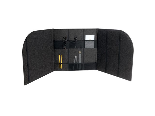 Perfekt för ökad koncentration och inlärning samt vid provskrivning. Skärmen är utrustad med förvaringsfack, pennhållare och remmar för förvaring av papper och studiematerial. Skärmen är upphängningsbar och hopvikbar vilket gör den till en platsbesparande ljudabsorbent.
