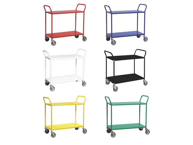 Lackerad bordsvagn i stålrörskonstruktion. 5 olika färger. Höjd övre hyllplan 760 mm, avstånd mellan hyllplan 530 mm. 4 länkhjul 125 mm, med grå gummibana.