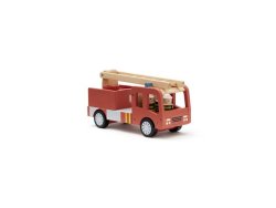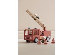 Brandbilens stege kan vridas både horisontellt och vertikalt och brandslangens munstycke kan fästas på stegen. Med de tre konerna kan man spärra av vägen så inga bilar kör förbi och hindrar brandmännen i sitt arbete.