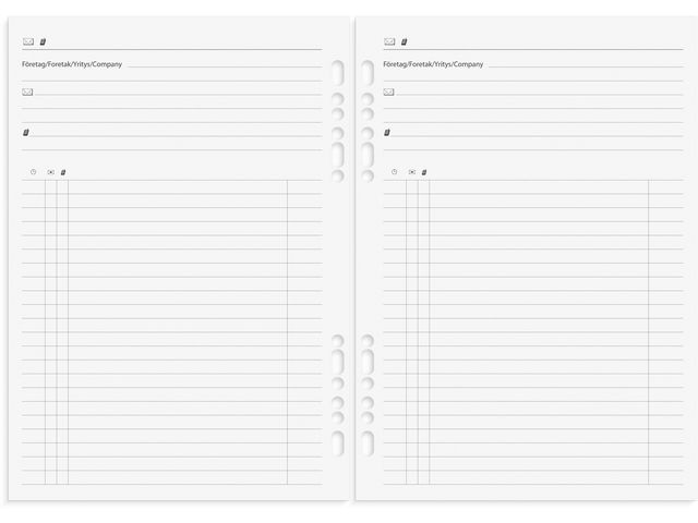 Systemkalender med grundsats. Grundsatsen innehåller hålad kalenderdel (4801) och blankettdel. Pärmen har ringmekanism (Ø 30 mm), fem kreditkortsfickor, stort myntfack med dragkedja, fack för kvitton o dyl och pennhållare.