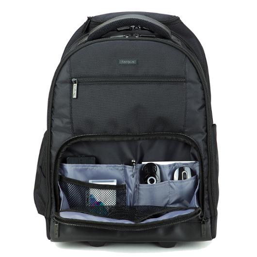 Dataväska som kombinerar det bästa av två världar. Ryggsäck och rullväska. Vid ett första ögonkast ser det ut som en vanlig ryggsäck men under ett skyddshölje finns både rullhjul och teleskophandtag.