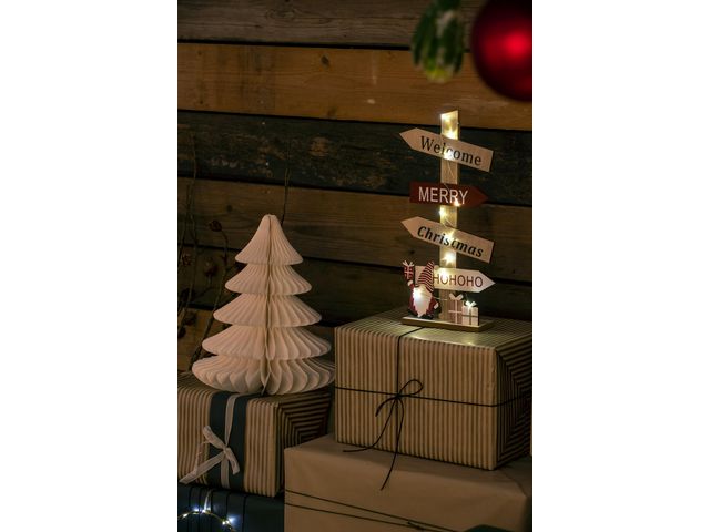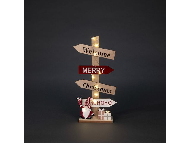 Siluett jultomte och vägvisare i trä. 10 varmvita LED, timer 6h. Drivs med 2 x AA batterier (ingår ej). Höjd 35,5cm, bredd 18,5cm.