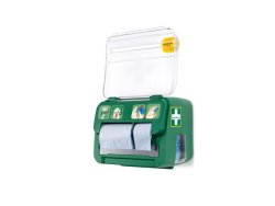 Cederroth Soft Foam Bandage 2-in-1 Dispenser innehållande två storlekar av Cederroth Soft Foam Bandage 6 cm x 4,5 m Blue och Cederroth Soft Foam Bandage 3 cm x 4,5 m Blue. Dispensern har en integrerad skärkniv för enkel användning med tydliga instruktioner. Kompakt storlek som gör den enkel att montera på väggen, även på små ytor.