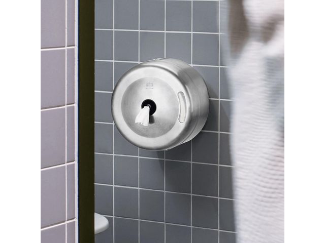 Robust dispenser i rostfritt stål, perfekt för krävande toalettutrymmen.