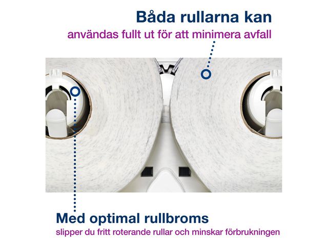 Välbesökta toalettutrymmen behöver effektivt kunna tillgodose toalettpapper och dispensern rymmer två rullar med hög kapacitet, vilket minskar risken för pappersbrist. Rullarna kan utnyttjas till fullo för minskat avfall, och dispensern kan fyllas på när som helst. Tack vare den optimala rullbromsen så minskar dessutom förbrukningen.