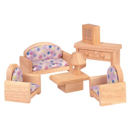 Vardagsrumsmöbler till dockhus. Fyll dockhuset med härliga vardagsrumsmöbler. - 6 delar: med tygdynor fåtöljx2, soffa, bord, TV-bänk, TV och lampa - Material: trä
