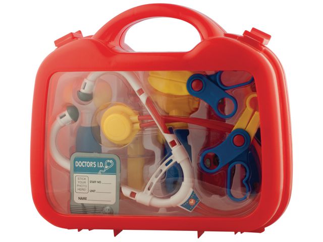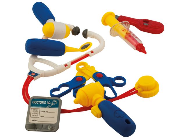 Stort lekset med stetoskop, Innehåller termometer, spruta och annan nödvändig utrustning för att undersöka och behandla dockor och gosedjur. Mått: 24,5 x 28 x 9 cm. Från 3 år - Tillverkad av: PS, PP, PVC och PET - Innehåller inte förbjudna ftalater