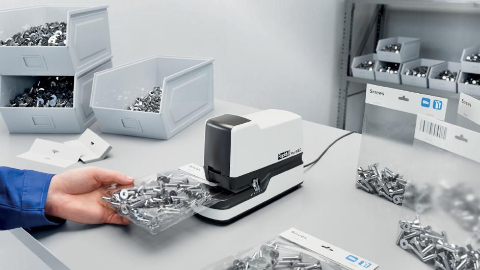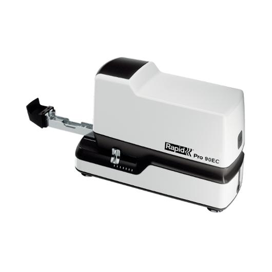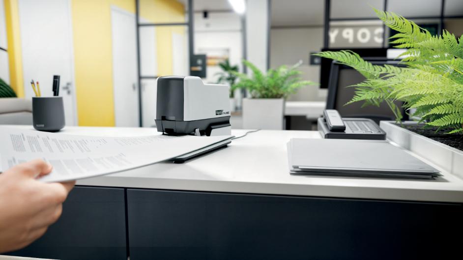 Enkel, slitstark och ljudsvag häftapparat med frontladdning och säkerhetsfunktion.