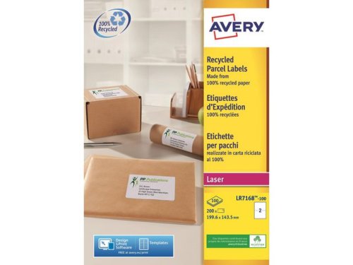 Vill du ha ett ?grönare? kontor? Använder du redan miljövänliga produkter? Om din arbetsplats vill göra vad den kan för att skona miljön, använd Avery LR7168-100 etiketter med QuickPEEL? av 100 % återvunnet papper med 2 etiketter/ark och 200 etiketter/förpackning. De är tillverkade av 100 % återvunnet papper, har ett vattenbaserat och miljövänligt lim samt är förpackade i återvunnen kartong. Och det slutar inte där! Produktionen av dessa etiketter är utformad för att undvika onödig avskogning samt förbruka mindre energi och vatten. Och förutom ett grönt samvete får du också snygga och knivskarpa utskrifter oavsett vilken typ av skrivare du använder. Averys JamFREE?-garanti säkerställer att du inte behöver bekymra dig för om etiketterna fastnar i skrivaren och orsakar stopp. Etiketterna har en pålitlig och permanent vidhäftning. På www.avery.eu hittar du massor av mallar som du kan använda för att enkelt och GRATIS designa och skriva ut dina Avery-etiketter. - Mått: 199,6x143,5 mm