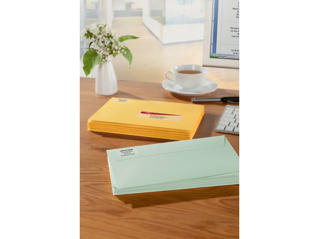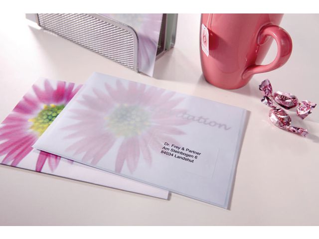 Vare sig dina kuvert är bruna, cremefärgade, silverfärgade, röda eller en helt annan färg vill du alltid se till att adressen är prydlig, tydlig och proffsig. Och ibland ger en vit etikett helt inte den look du är ute efter! Med Avery L7551-25 transparenta etiketter 38,1 x 21,2 mm med 65 etiketter/ark och 1 625 etiketter/förpackning kan du skriva ut prydliga och proffsiga etiketter som blir nästan osynliga på kuvertet så att bara den knivskarpa texten syns. Kan skrivas ut med alla sv/v- och färglaserskrivare. Etiketterna är lämpliga för en rad olika användningsområden där du behöver använda permanent märkning, t.ex. adressetiketter på små brev, märkning av föremål eller organisering av mappar. De fäster säkert, tillförlitligt och permanent på alla slags släta ytor. Etiketterna har en pålitlig och permanent vidhäftning. QuickPEEL?-funktionen sparar tid eftersom den gör att etiketterna är lättare att ta av och sätta på. På www.avery.eu hittar du massor av mallar som du kan använda för att enkelt och GRATIS designa och skriva ut dina Avery-etiketter. - Mått: 38,1 x 21,2 mm - Färg: Transparent