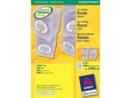 Runda produktetiketter Gratisprover, rabatter och erbjudanden är bara några av de säljfrämjande åtgärder som du kan vidta för att öka din omsättning. Fånga kundernas uppmärksamhet med etiketter i speciella former som är idealiska för reklam och säljfrämjande klistermärken. Oavsett vilken typ av kampanj du driver kan du använda Avery L3415-100 runda produktetiketter med 24 etiketter/ark och 2 400 etiketter/förpackning för att göra etiketter med ditt eget budskap precis när du behöver dem, och i det antal du behöver. Etiketterna är permanenthäftande på alla vanliga ytor som glas, plast, papper osv. ? även på krökta ytor. Averys runda produktetiketter kan skrivas ut med alla sv/v- och färglaserskrivare och hjälper dig också att bevara miljön, då de är FSC®-certifierade och därmed bara producerade av papper från hållbart skogsbruk och kan återvinnas tillsammans med vanligt pappersavfall. - Mått: Ø 40 mm - Form: Rund - Bläckstråleskrivare - Färglaserskrivare - Svartvit laserskrivare - Kopieringsmaskin