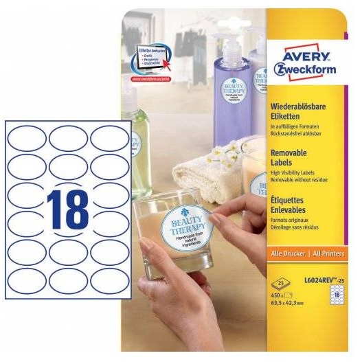 Vit etikett Avery avtagbar 63,5x42,3mm, 25 ark/fp