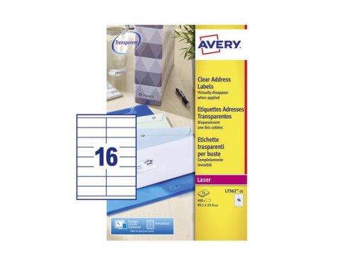 Vare sig dina kuvert är bruna, cremefärgade, silverfärgade, röda eller en helt annan färg vill du alltid se till att adressen är prydlig, tydlig och proffsig. Och ibland ger en vit etikett helt inte den look du är ute efter! Med Avery L7562-25 transparenta etiketter 99,1 x 33,9 mm med 16 etiketter/ark och 400 etiketter/förpackning kan du skriva ut prydliga och proffsiga etiketter som blir nästan osynliga på kuvertet så att bara den knivskarpa texten syns. Kan skrivas ut med alla sv/v- och färglaserskrivare. Etiketterna är lämpliga för en rad olika användningsområden där du behöver använda permanent märkning, t.ex. adressetiketter på små brev, märkning av föremål eller organisering av mappar. De fäster säkert, tillförlitligt och permanent på alla slags släta ytor. Etiketterna har en pålitlig och permanent vidhäftning. QuickPEEL?-funktionen sparar tid eftersom den gör att etiketterna är lättare att ta av och sätta på. På www.avery.eu hittar du massor av mallar som du kan använda för att enkelt och GRATIS designa och skriva ut dina Avery-etiketter. - Etiketter för alla utgående brev eller paket - Med QuickPEEL? som hjälp vid avdragning - Lämpliga för laserskrivare, färglaserskrivare och kopiatorer - Skapa dina personliga etiketter med hjälp av den kostnadsfria programvaran Avery & Print Design - Enkel att använda - Återvinningsbar - Form: Rundade hörn - Format: A4 - Totalt antal etiketter: 400 - Mått: 99,1 x 33,9 mm - Färg: Genomskinlig