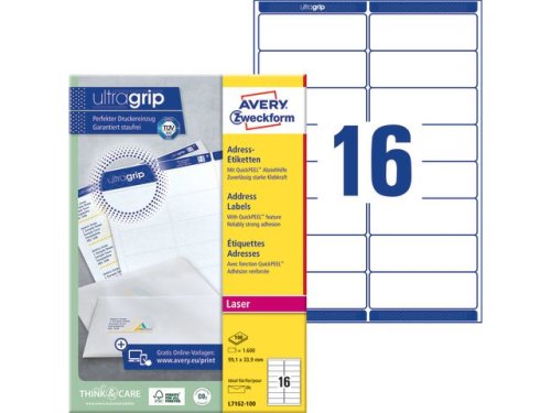 Avery-adressetiketter är utformade för att sitta fast och är utskrivbara i svartvitt eller färg. De ger ett professionellt utseende på alla dina kuvert eller mindre paket. JamFREE-garantin säkerställer att etiketterna smidigt behandlas i skrivaren varje gång och med QuickPEEL-tekniken går det snabbt att fästa etiketter. Det är bara att dela upp etiketter på arket längs perforeringen för att exponera etikettens kanter och sedan dra och fästa. Det gör märkningen av din post så mycket snabbare. Dessa FSC®-certifierade etiketter är inte bara miljövänligarea. De skrivs ut med en knivskarp bild och klara färger. Du kan också skapa din egen personliga prägel, till exempel din företagslogotyp, med hjälp av programvarumallar från Avery Design Print. - Etiketter för alla utgående brev eller paket - Med QuickPEEL som hjälp vid avdragning - JamFREE-utskriftssystemet säkerställer att inga rester finns kvar på skrivaren - Lämpliga för laserskrivare, färglaserskrivare och kopiatorer - Skapa dina personliga etiketter med hjälp av den kostnadsfria programvaran Avery Print Design - Enkel att använda - Återvinningsbar - Certifiering: FSC - Form: Rundade hörn - Format: A4 - Totalt antal etiketter: 1600 - Mått: 99,1 x 33,9 mm - Färg: Vit