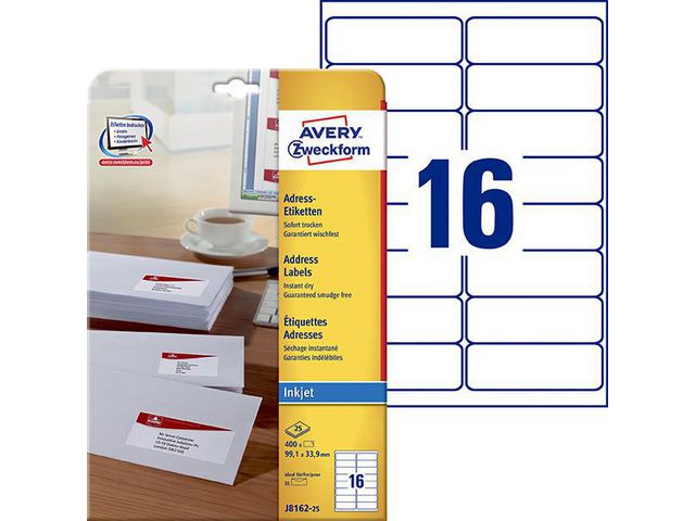 Snabbtorkande etiketter för bläckstråleskrivare. Den specialbelagda QuickDRY?-ytan gör att bläcket omedelbart absorberas i papperet så att du kan ta arket direkt från skrivaren och använda etiketterna utan att riskera kladd från bläcket.