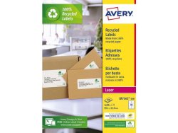 Avery QuickPEEL-etiketter av 100 % återvunnet papper med 16 etiketter per ark och 1600 etiketter per förpackning. Tillverkade av 100 % återvunnet papper, har ett vattenbaserat och mer miljövänligt lim samt är förpackade i återvunnen kartong. Produktionen av dessa etiketter är utformad för att undvika onödig avskogning samt förbruka mindre energi och vatten.