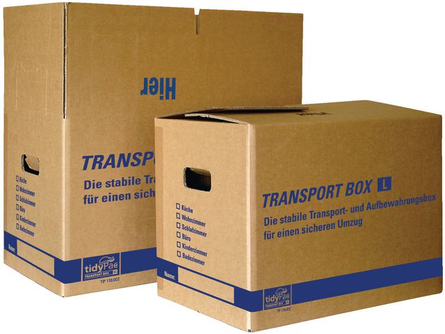 Flyttlåda TidyPac är tillverkad i 2-lagers wellpapp. Utrustad med standardtryck, något som kan användas för markering av innehållet.