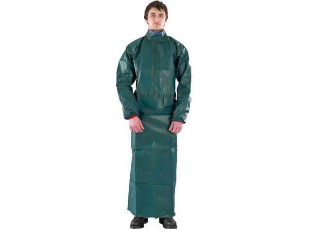 Med kardborrfäste vid halsen och knytband i midjan. Dubbla manschetter med stickad innermudd samt svetsade och tejpade sömmar. Ger ett utomordentligt kemikalieskydd. Produkten är CE-märkt.