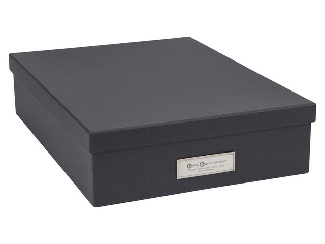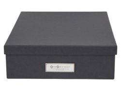 Skapa ordning och reda på skrivbordet med denna förvaringsbox i snygg design. Förvaringsbox med lock och etiketthållare som hjälper dig att hålla ordning bland dina dokument. Förvarar tidningar, kataloger, broschyrer med mera. Elegant design som passar i de flesta hem och kontor. - Tillverkade av 100 % återvunnet returpapper - FSC-certifierat - Mått (LxBxH): 35x26x8,5 cm - Volym: 7,75 Liter