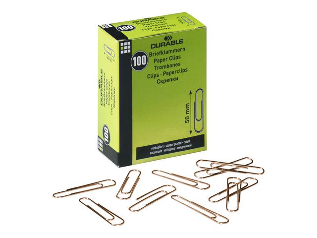 Bunta ihop dokument utan att behöva häfta med de här kopparbelagda pappersklämmorna från Durable. Fyll på med de här kopparbelagda pappersklämmorna från Durable ? ett enkelt sätt att bunta ihop dokument utan permanenta häftklamrar. Det här paketet med pappersklämmor är perfekt att ha till hands på kontoret, hemma och i skolan. Den klassiska designen ger ett tillförlitligt grepp och håller ihop papper snyggt och prydligt. De här stora 50 mm kopparbelagda pappersklämmorna från Durable är ett smart sätt att hålla ordning på rapporter, räkningar eller skolarbete. - Håll ordning på pappersarbetet utan häftklamrar - Klassiska pappersklämmor i metall - Idealisk för hemmet, kontoret och skolan - Färg: Kopparbeläggning, nickelfri - Mått: 50 mm - Antal: 100