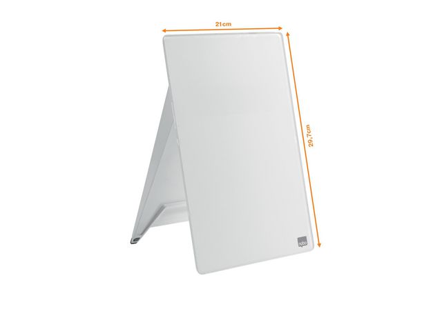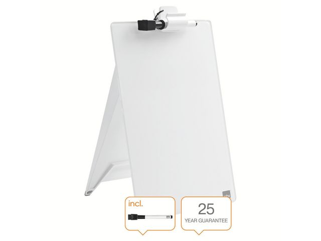 Whiteboardstaffli med glasyta från Nobo® till skrivbord förenar elegant, modern design med maximal funktion. Whiteboardstaffli med glasyta för skrivbord med elegant, modern design med maximal funktion. Staffliets ramfria whiteboardyta har hög motståndskraft mot fläckar och repor. Utmärkt noteringsverktyg, det är bara att skriva, torka, rensa bort och börja om igen. Du kan även använda den praktiska klämman som medföljer för att fästa dokument. En mini Nobo-whiteboardpenna med en taveltorkare på locket medföljer. - Ytmaterial: Glas - Går att använda vanliga WB-pennor - Snygg och funktionell - Ramlös och med whiteboardfunktion - Hög motståndskraft mot bläckfläckar, pennmärken, repor och bucklor. - Enkel rengöring - Speciella egenskaper: Levereras med en mini Nobo whiteboardpenna med en taveltorkare på locket. - Perfekt för skrivbordsanvändning - Tavlan är INTE magnetiskt - 25 års garanti - Mått: 220 x 300 mm - Vikt: 1 kg - Färg: Klarvit