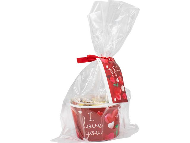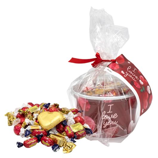 Perfekt gåva till alla hjärtan - Inslagna lyxpraliner som mjölkchokladhjärtan med hasselnötsfyllning, mjölkchokladpraliner med mera.