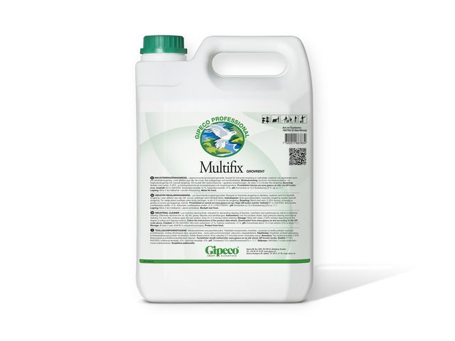 Högeffektivt lågskummande grovrengöringsmedel, tensidbaserat utan kolväten. Gipeco Multifix är avsedd för krävande rengöring av verkstäder, maskiner och lagerlokaler, samt vid industriell rengöring. Har ett brett användningsområde och är speciellt utformat för att snabbt tränga igenom och effektivt lösa upp fet smuts och feta beläggningar innehållande olja, sot, fett etc. Är även effektivt för borttagning av handbollsklister. Kan användas för både manuell rengöring och städmaskin. - Lågskummande rengöringsmedel - Avsedd för rengöring i verkstäder, maskiner, lagerlokaler och industriell rengöring - pH (koncentrat): ca 13,4 - pH (2% brukslösning): ca 11,7 - Volym: 5 liter