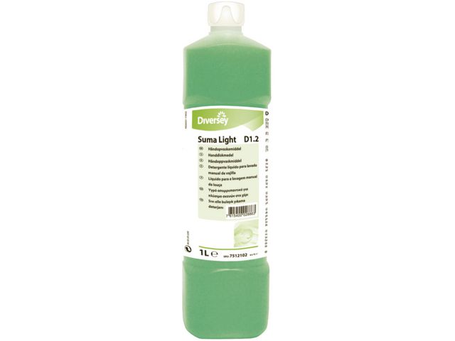 Handdisk Light D1.2 1L - pH-värde: 6 (koncentrat) - Lätt parfymerad - Dosering: Dosera 1 ml av Suma Light D1.2 per liter varmt vatten. För svårt nedsmutsat diskgods, kan en högre dosering vara nödvändig. Faktisk dosering är beroende av lokala förhållanden (vattenhårdhet, smutsighetsgrad samt metodik) - Utseende: Grön vätska