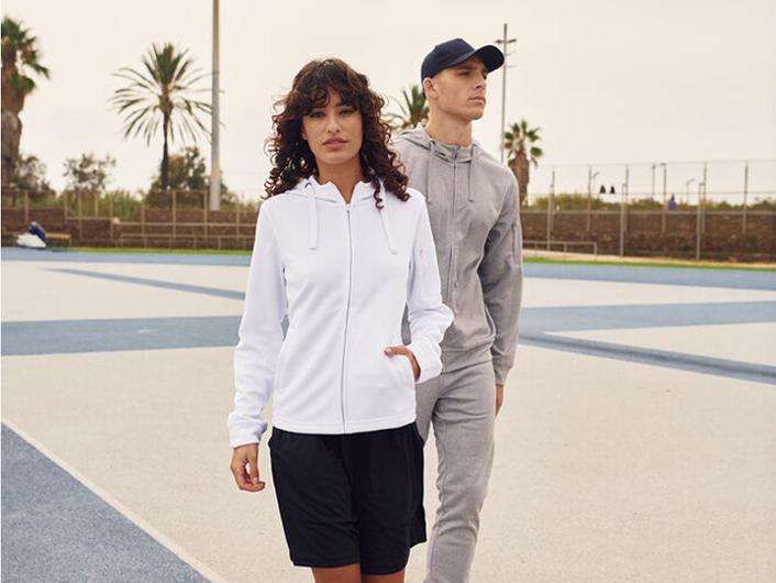 En spun dyed hoodtröja med hel dragkedja. Ton-i-ton dragkedja framtill, på de två frontfickorna samt på ärmficka. Flata snören i huvan, fiskbensmönstrat nackband i halsen, ribbad mudd i ärmavslut och nedtill. Utrustad med smart lösning för hörlurar. En avtagbar nacketikett för att enkelt kunna addera egen avsändare.