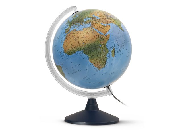 Upptäck världen! Jordglob med en diameter på 30 cm. Jordgloben har belysning och har en fot i mörkblå plast och en meridian i frostad plast. När jordgloben är släckt visas en geografisk kartbild där man ser öken, skog, berg och hav. Tänd globen och länderna träder fram i olika färger vilket gör det lättare att urskilja landsgränser. - Diameter: 30 cm - Belysning - Svensk text - Tillverkad av: Ftalatfri polystyren