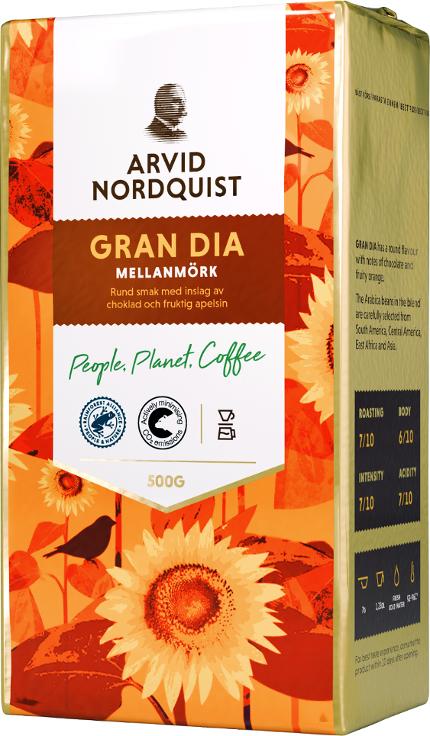 Arvid Nordquist Gran Dia är ett mellanmörkt kaffe med nötiga toner och en behaglig beska. Kaffet har en doft med inslag av knäck. Eftersmaken är generös och rund. Mellanmörkt kaffe gjort på 100% Arabicabönor. Arvid Nordquist Gran Dia är ett mellanmörkt kaffe med nötiga toner ocvh en behaglig beska. Kaffet har en doft med inslag av knäck. Eftersmaken är generös och rund. Bönorna är 100% Arabicabönor och kommer från Brasilien, Centralamerika, Colombia och Östafrika. Arvid Nordqvist Gran Dia är 100% hållbart certifierat (UTZ certifed) och 100% klimatkompenserat. - Mellanmörkt - 100 % Arabicabönor - Vikt: 500 gram