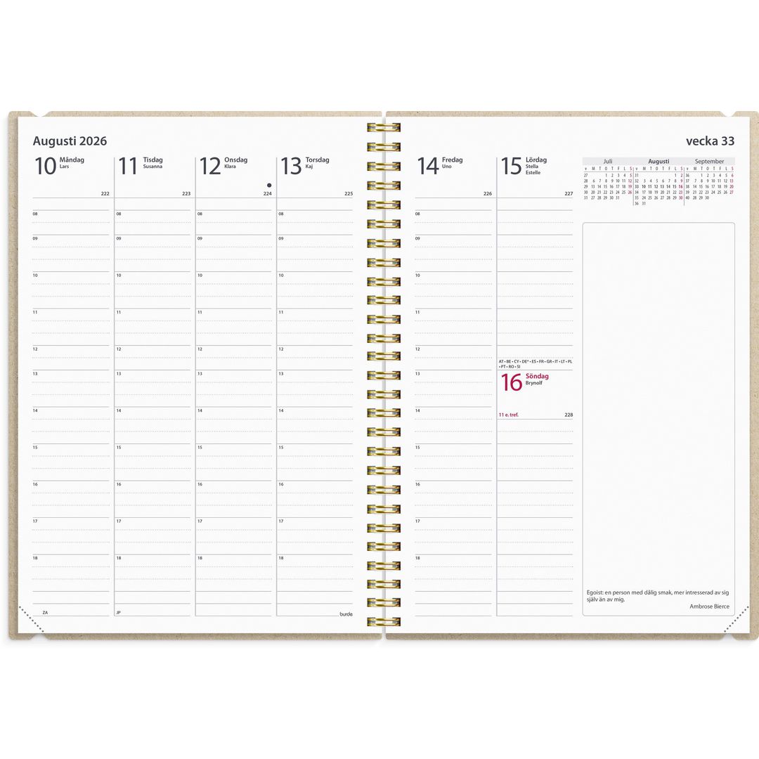 En kalender med ett omslag i återvunnen kartong och guldprägling. Att ha flyt på jobbet handlar till stor del om konsten att planera. Det här är kalendern för dig som vet att arbetsdagen lätt blir hektisk och snabbt fylls på med möten och uppgifter, och vill ha bra översikt över din veckoplanering. När du vet vad som väntar varje dag blir du mer effektiv och chansen är större att du når dina mål.Kalender 2026 från Burde. Format: A5. Layout: Stående. Vecka/uppslag. Timindelning 8-18. Kalendarium: 2025-11-24 - 2027-01-03.Omslag: Återvunnen kartong. Spiralbunden. Detaljer: Gummiband. Pappersficka. Innehåll: Kyrkliga helgdagar, Flaggdagar, Helgdagar/aftnar, Internationella helgdagar, Månfaser, Namnsdagar, Internationella helgdagar översikt, Temadagar/händelser, Årsöversikt/årsöversikter, Årsplan/årsplaner. Antal sidor: 128. Miljöinformation: FSC®. Omslag i återvunnen kartong.