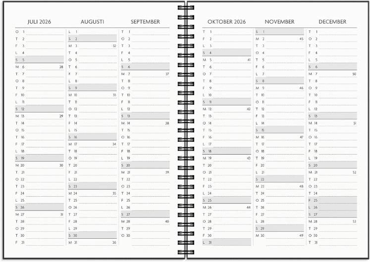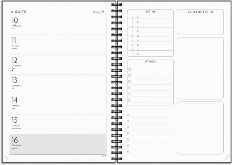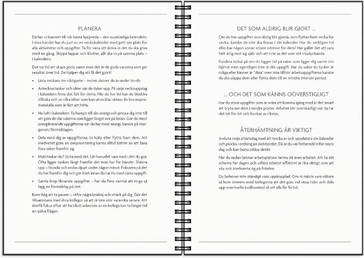 Få det Gjort är en smakfull kalender med bra möjlighet att komplettera dina redan existerande tekniska lösningar. En kombination av analog och digital planering är ett vinnande koncept för din vardags- och jobbplanering! A5 kalendern har veckouppslag med hela veckan i en horisontell layout på vänster sida och till höger finner du olika listor för inköp, prioriteringar och möten. Lägg till ett stilfullt omslag eller uppskatta den stilrena svart/vita designen precis som den är.