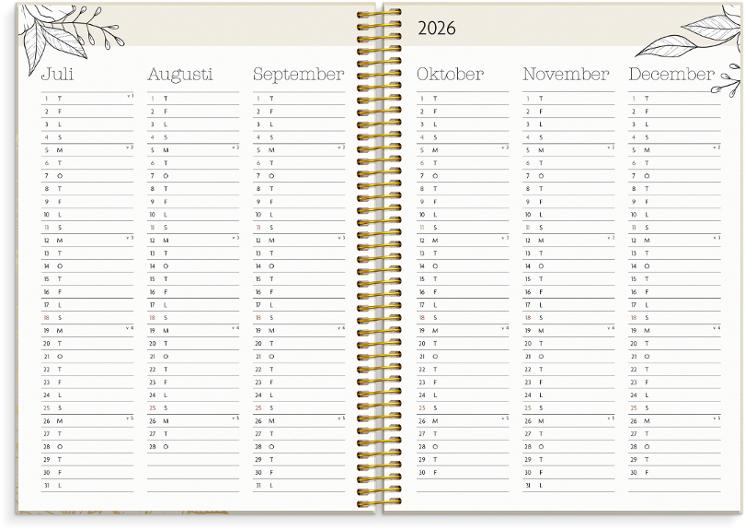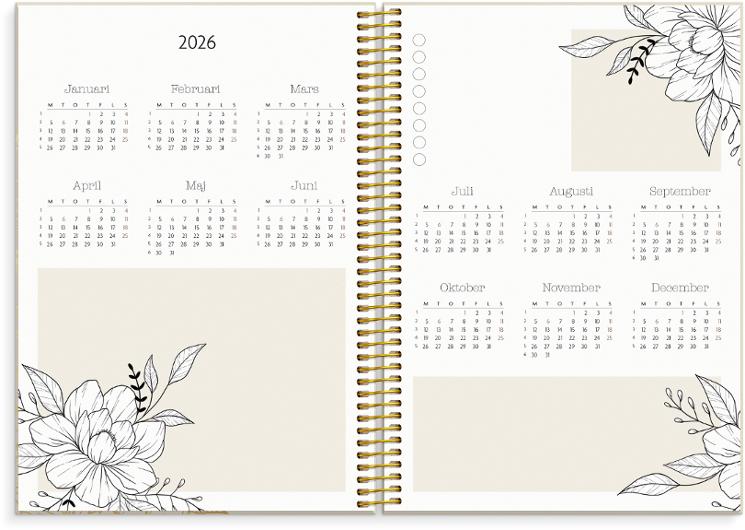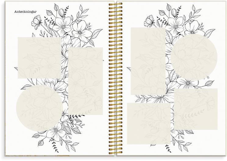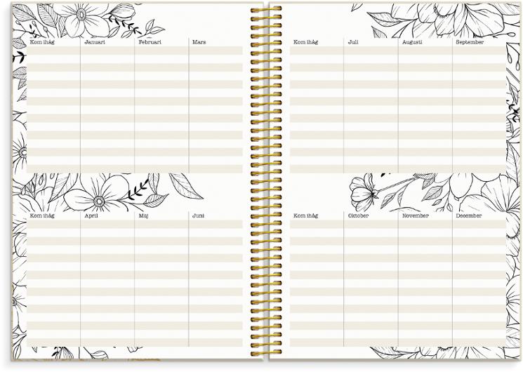 En kalender med en smakfull och romantisk inlaga, med handritade blomsterillustrationer. Välj att behålla den dämpade färgskalan eller själv sätta färg på den. Life Planner Bloom har ett tjockare papper för att förhindra att pennor blöder igenom till nästa sida. Veckouppslag samt månadsuppslag med plats för planering och anteckningar. Årsöversikt och extrasidor med kom ihåg-listor samt anteckningssidor.