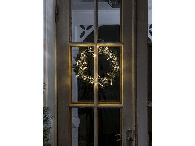 Ett vackert alternativ till den traditionella julstjärnan - en krans i metall med LED-ljus. Dekorativ krans i silverfärgad metall med 32 varmvita LED, som skapar en välkomnande känsla den mörka årstiden. Höjd 30 cm, bredd 30 cm. Transparent anslutningssladd 500 cm. Godkänd för inomhusbruk och drivs med en 24V transformator.  - Färg: Silver  - Ljusfärg: Varmvit  - Kabelfärg: Transparent  - Material: Stål  - Bredd: 30cm  - Djup: 7cm  - Höjd: 30cm  - Antal lampor: 32  - Anslutningskabelns längd: 500cm  - Transformator ingår  - IP20/24V  - För inomhusbruk