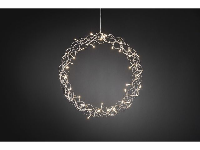 Dekorativ krans i silverfärgad metall med 48 varmvita LED, som skapar välkomnande känsla den mörka årstiden. Höjd 45 cm, bredd 45 cm. Transparent anslutningssladd 500 cm. Godkänd för inomhusbruk och drivs med en 24V transformator.