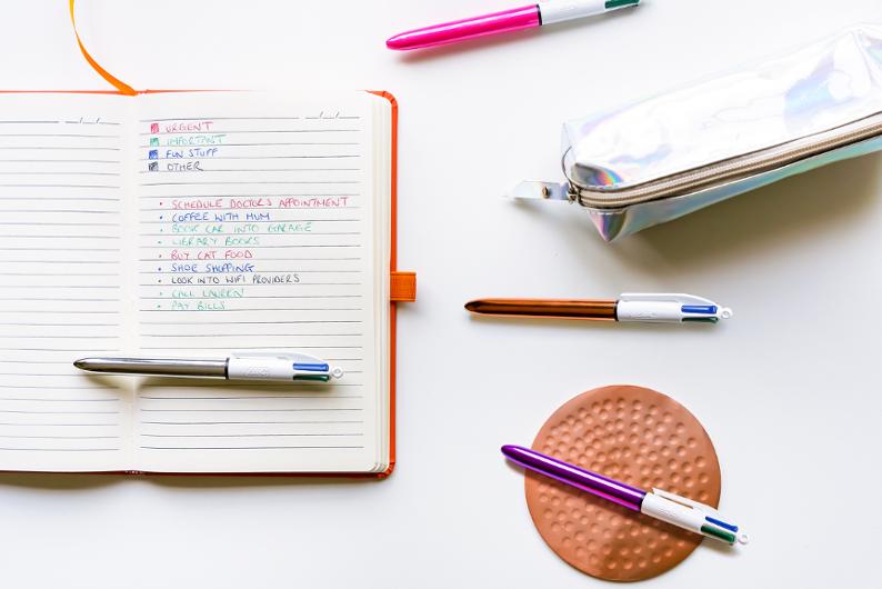BIC 4 Colours Shine har en snygg, modern metallic-look med rund pennkropp och en fickklämma som är lätt att fästa på anteckningsböcker.